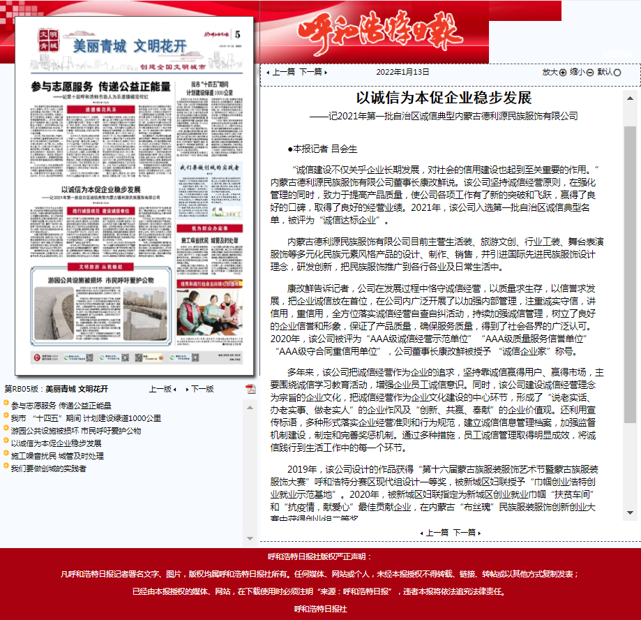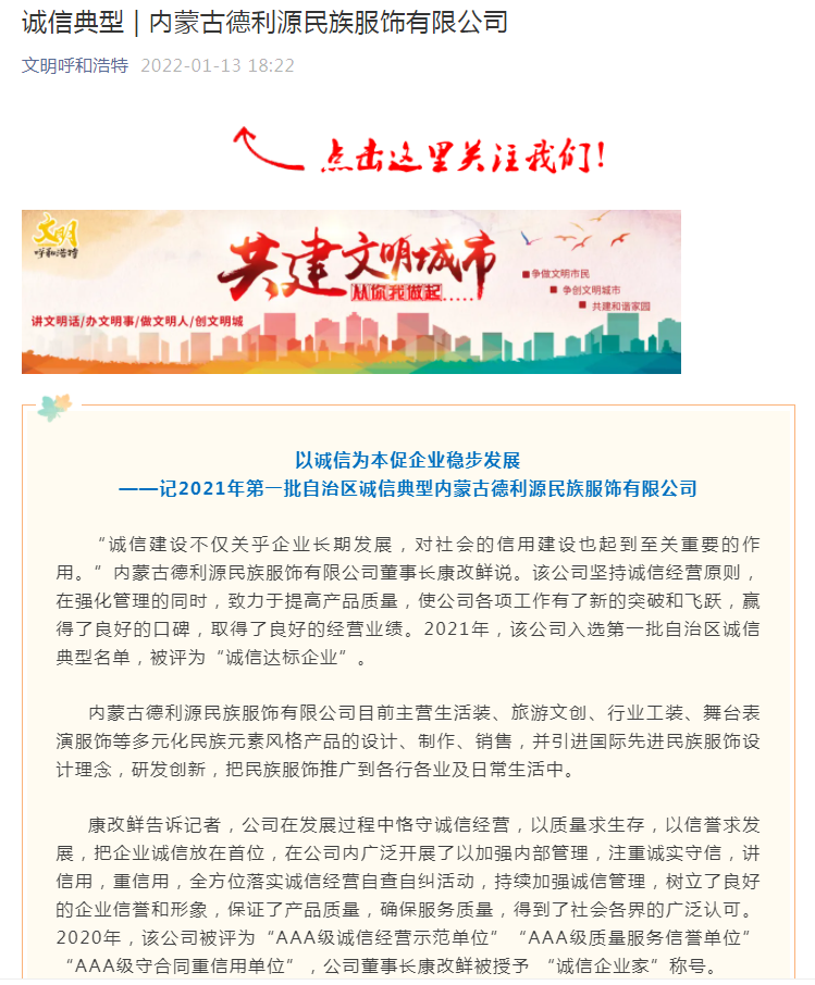 (誠信企業(yè))記2021年第一批自治區(qū)誠信典型內(nèi)蒙古德利源民族服飾有限公司